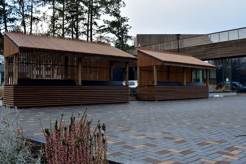 Aikštėje priešais Neringos savivaldybės pastatą pastatyti nameliai – prekybos gintarais vietos. Šios vietos laimėtos viešojo konkurso būdu. Nameliai – vietas laimėjusių verslininkų investicijos bei pastangos, kad naujosios prekybos vietos derėtų prie esamos aplinkos. Iš viso aikštėje numatytos šešios prekybos vietos. Į aikštę atkeliavę nameliai talpina keturias prekybos vietas. an7-2