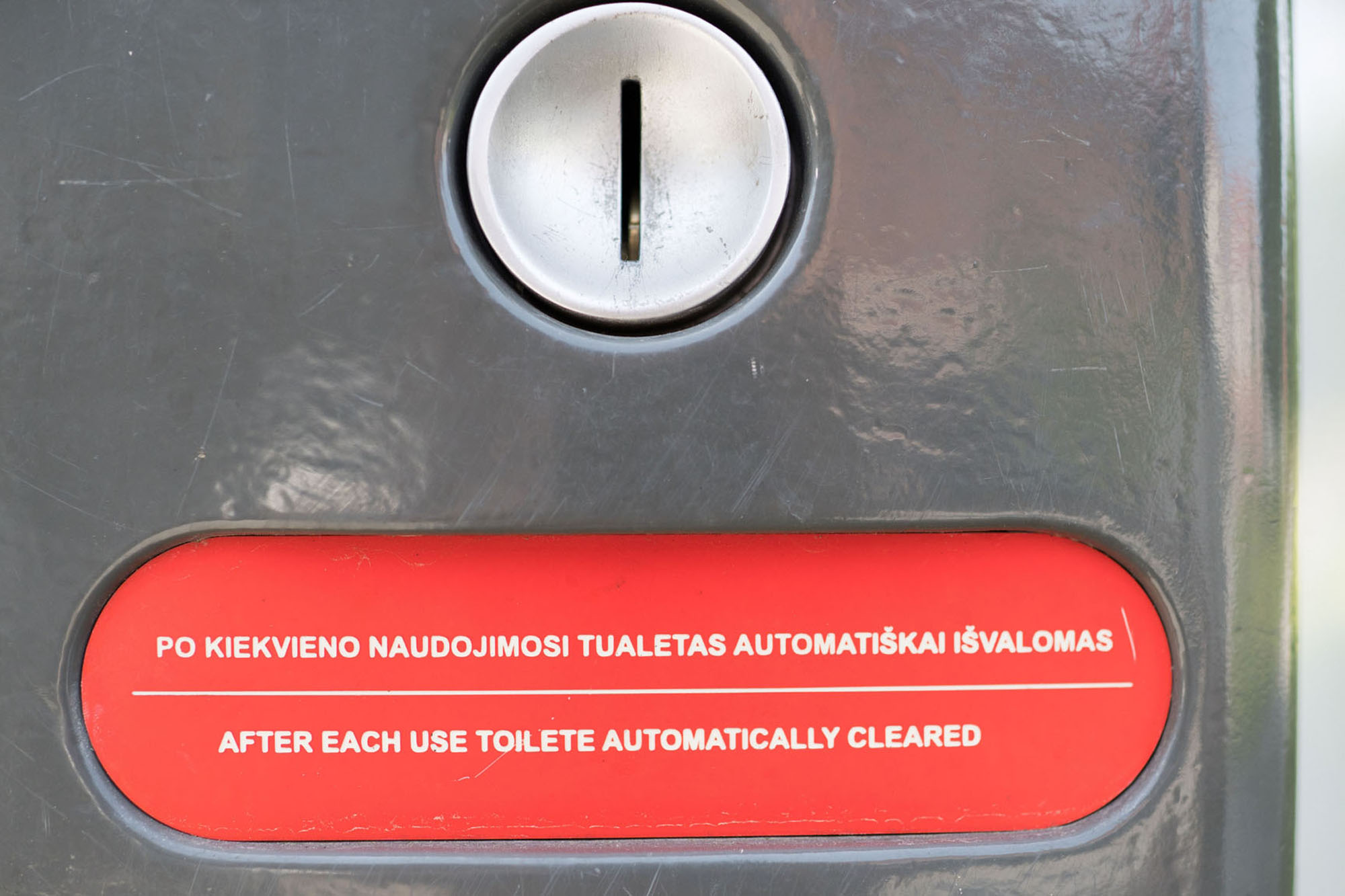 Vis dėlto pabandėme tualetą atidaryti. Jis mokamas. Kainuoja 30 ct. Parašyta, kad priimamos tik 10 ir 20 ct nominalo monetos, grąža neišduodama, kortelių skaitytuvo nėra.