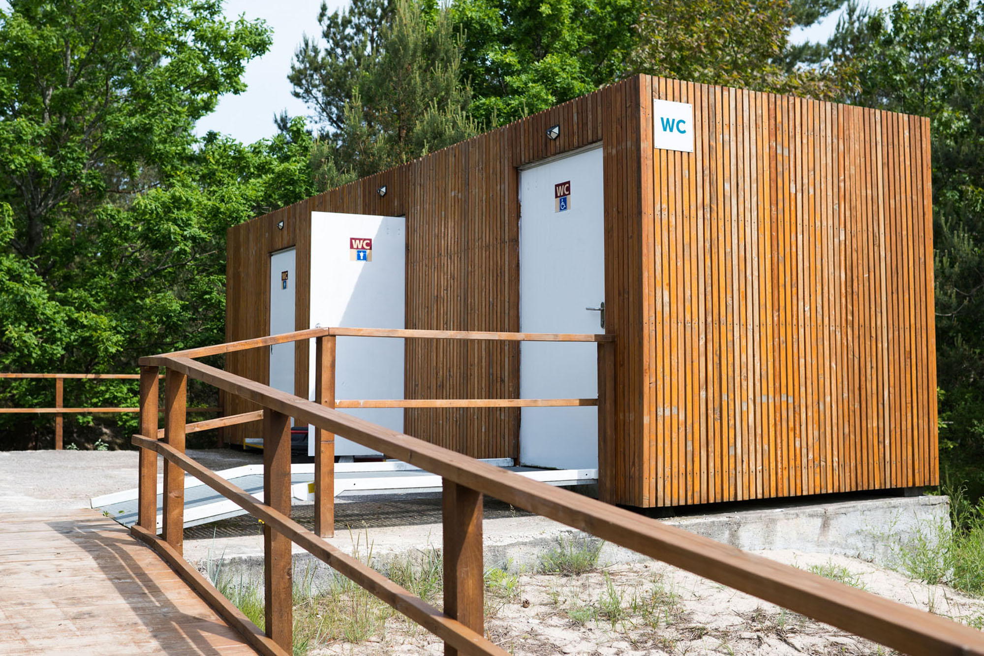 Centriniame paplūdimyje taip pat radome du tvarkingus biotualetus prie automobilių stovėjimo aikštelės ir konteinerinį tualetą paplūdimio prieigose su atskirais įėjimais vyrams, moterims ir neįgaliesiems. Pastarųjų tualetas buvo taisomas.