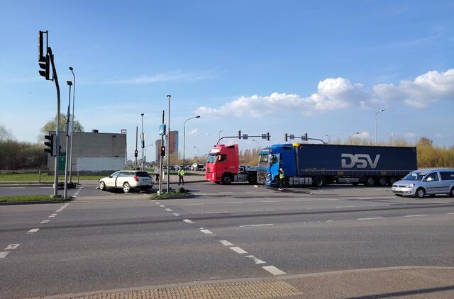 Joje vilkikas „Volvo“ susidūrė su lengvuoju automobiliu „Subaru“.