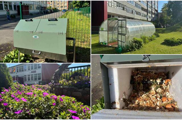 Todėl kompostuojama tik maža dalis to, kas susikaupia virtuvėje – kiaušinių lukštai ir žaliosios atliekos iš teritorijos. Pirmąją komposto partiją jie jau pasigamino ir ja patręšė darželį puošiančius gėlynus.