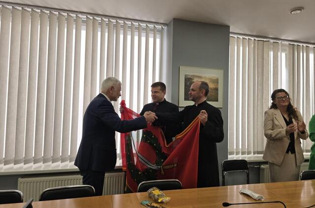 Vėliava šiandien, dalyvaujant piligrimus į kelionę lydėjusiems kunigams Mindaugui Stoniui ir Viktorui Ačui, tikybos mokytojai Neringai Žemgulienei bei piligriminės kelionės organizatorei, Savivaldybės tarybos narei Monikai Ruškytei, įteikta Klaipėdos rajono merui Broniui Markauskui.