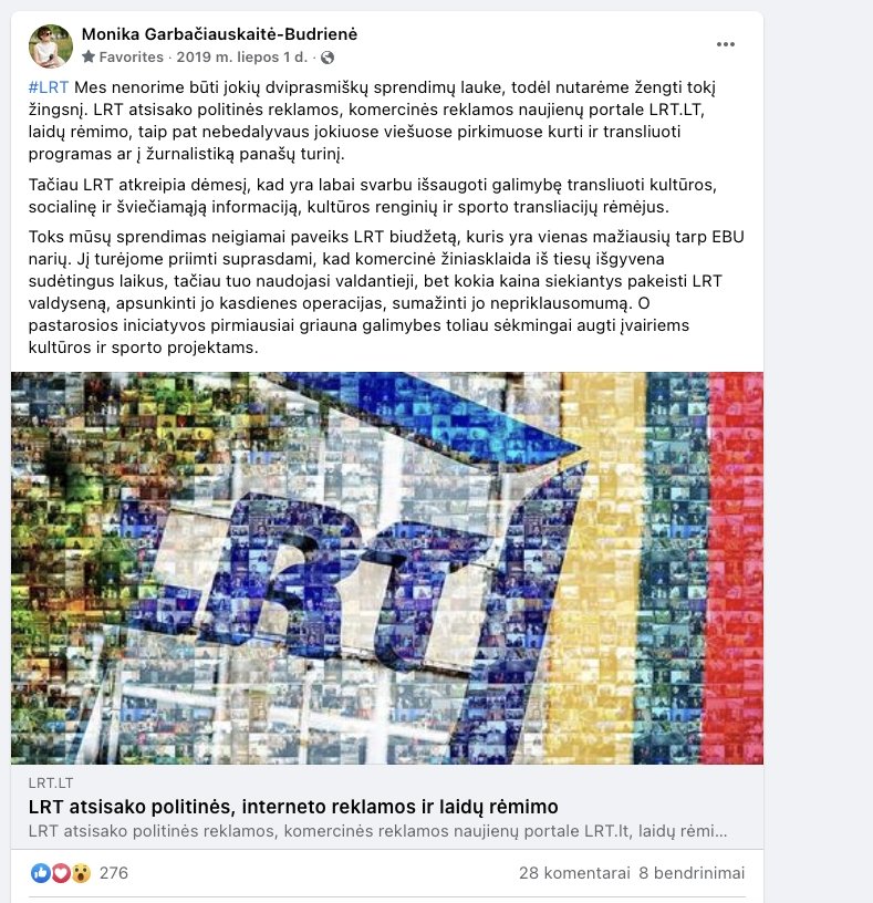 „Mes nenorime būti jokių dviprasmiškų sprendimų lauke, todėl nutarėme žengti tokį žingsnį. LRT atsisako politinės reklamos, komercinės reklamos naujienų portale LRT.LT, laidų rėmimo, taip pat nedalyvaus jokiuose viešuose pirkimuose kurti ir transliuoti programas ar į žurnalistiką panašų turinį“, - feisbuke anuomet rašė M. Garbačiauskaitė-Budrienė.