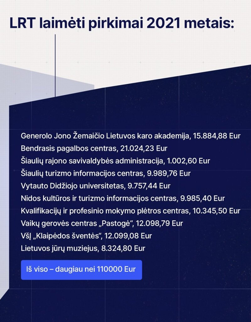Taigi iš viso LRT 2021 m. dalyvaudama pirkimuose, nors 2019 m. žadėjo to daugiau nedaryti, iš jų surinko 110507 Eur.