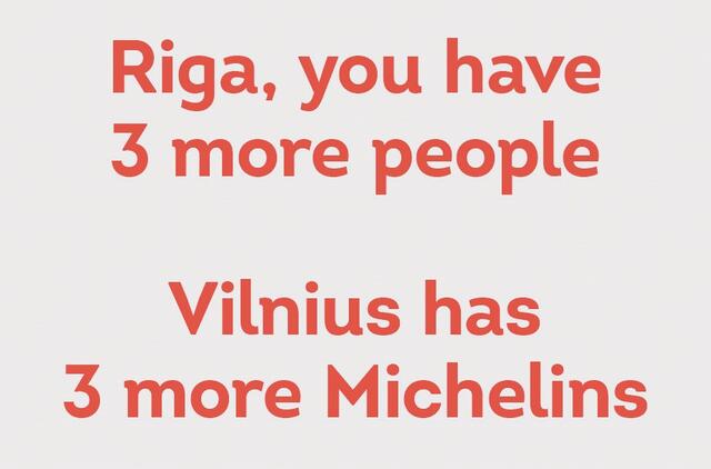 (1)Socialiniame tinkle agentūra „Go Vilnius" neseniai kreipėsi į Rygos turizmo agentūrą „Live Ryga" ir pasijuokė, kad Ryga gal gali džiaugtis, jog turi 3 naujus gyventojus, o Vilnius turi 3 „Michelin" žvaigždutes. Tačiau daliai internautų toks juokas pasirodė netinkamas.