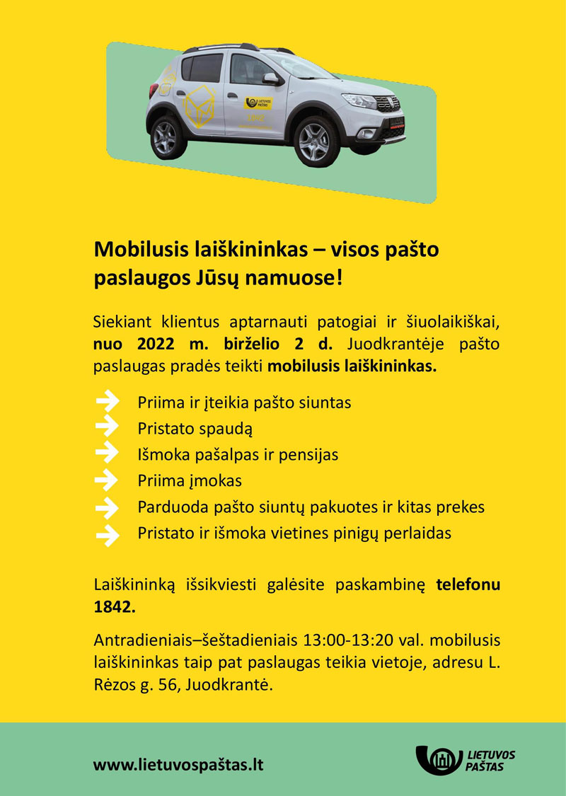 Taip pat, siekdamas klientams suteikti kuo daugiau patogumo, Lietuvos paštas juodkrantiškiams pristato šiuolaikišką sprendimą - nuo birželio 2 d. Juodkrantėje pašto paslaugas pradės teikti mobilusis laiškininkas. Jis ne tik priims ir įteiks pašto siuntas ar pristatys spaudą, bet ir suteiks pensijos ar pašalpos išmokėjimo bei kitas paslaugas. Mobilųjį laiškininką bus galima išsikviesti paskambinus telefonu 1842.
