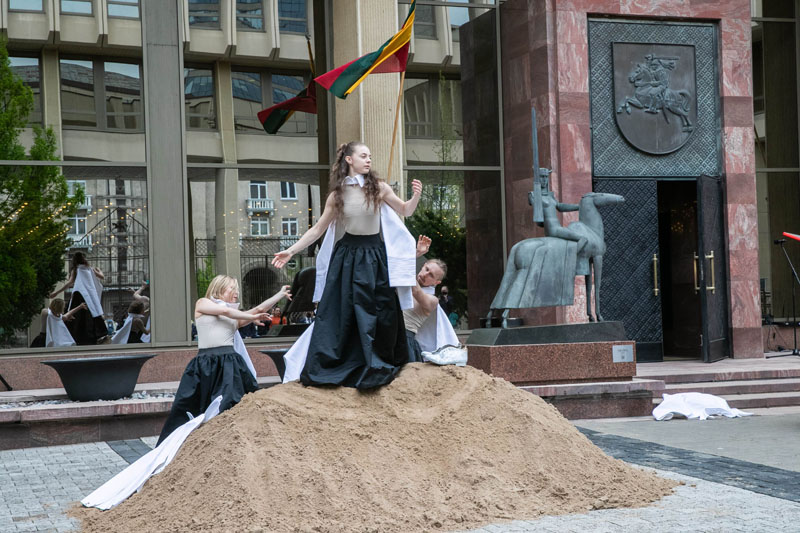 Seimo rūmų Didžiajame kieme pristatyto šokio spektaklio „Laikas nė(e)rimui“ ištrauka susirinkusius stebino ne tik mistiška atmosfera, įspūdingais kostiumais, bet ir Vilniaus centre sukurtu pajūrio scenovaizdžiu. Vilniaus savivaldybės įmonė „Grinda“ pasirodymui parūpino toną smėlio.