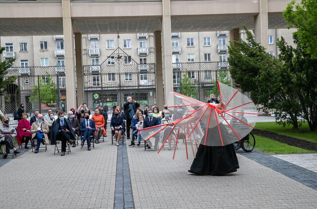 NUSTEBINO. Seimo rūmų Didžiajame kieme pristatyto šokio spektaklio „Laikas nė(e)rimui“ ištrauka susirinkusius stebino ne tik mistiška atmosfera, įspūdingais kostiumais, bet ir Vilniaus centre sukurtu pajūrio scenovaizdžiu. Džojos Gundos BARYSAITĖS nuotr.
