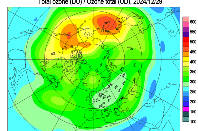 Žemėlapyje – ozono sluoksnio storis (DU vienetais) šiauriniame pusrutulyje 2024 m. gruodžio 29 dieną. Šaltinis: pasaulinis ozono ir ultravioletinės Saulės spinduliuotės duomenų centras (WOUDC).