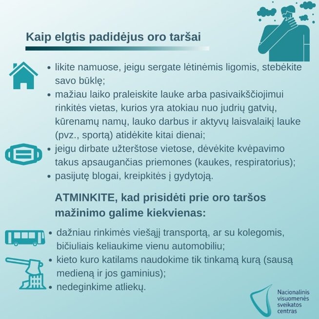 Specialistai sako, kad esant padidėjusiai oro taršai reikėtų vengti buvimo lauke arba, jei to neišeina padaryti, jį minimalizuoti kiek tik tai įmanoma labiau.