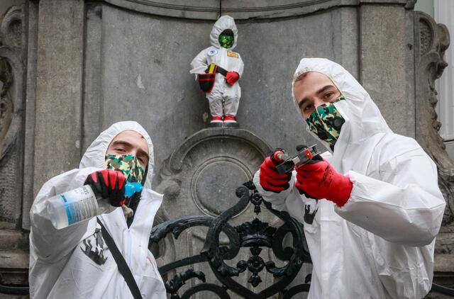 Belgijoje net besišlapinančio berniuko skulptūra buvo aprengta apsaugos nuo koronaviruso drabužiais, tačiau valdžiai teismas nurodė, kad įvesti karantino reikalavimus ji neturėjo pakankamo teisinio pagrindo. EPA-Eltos nuotr.