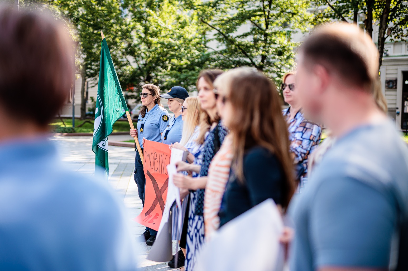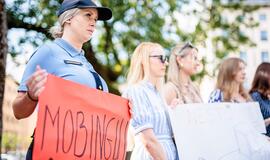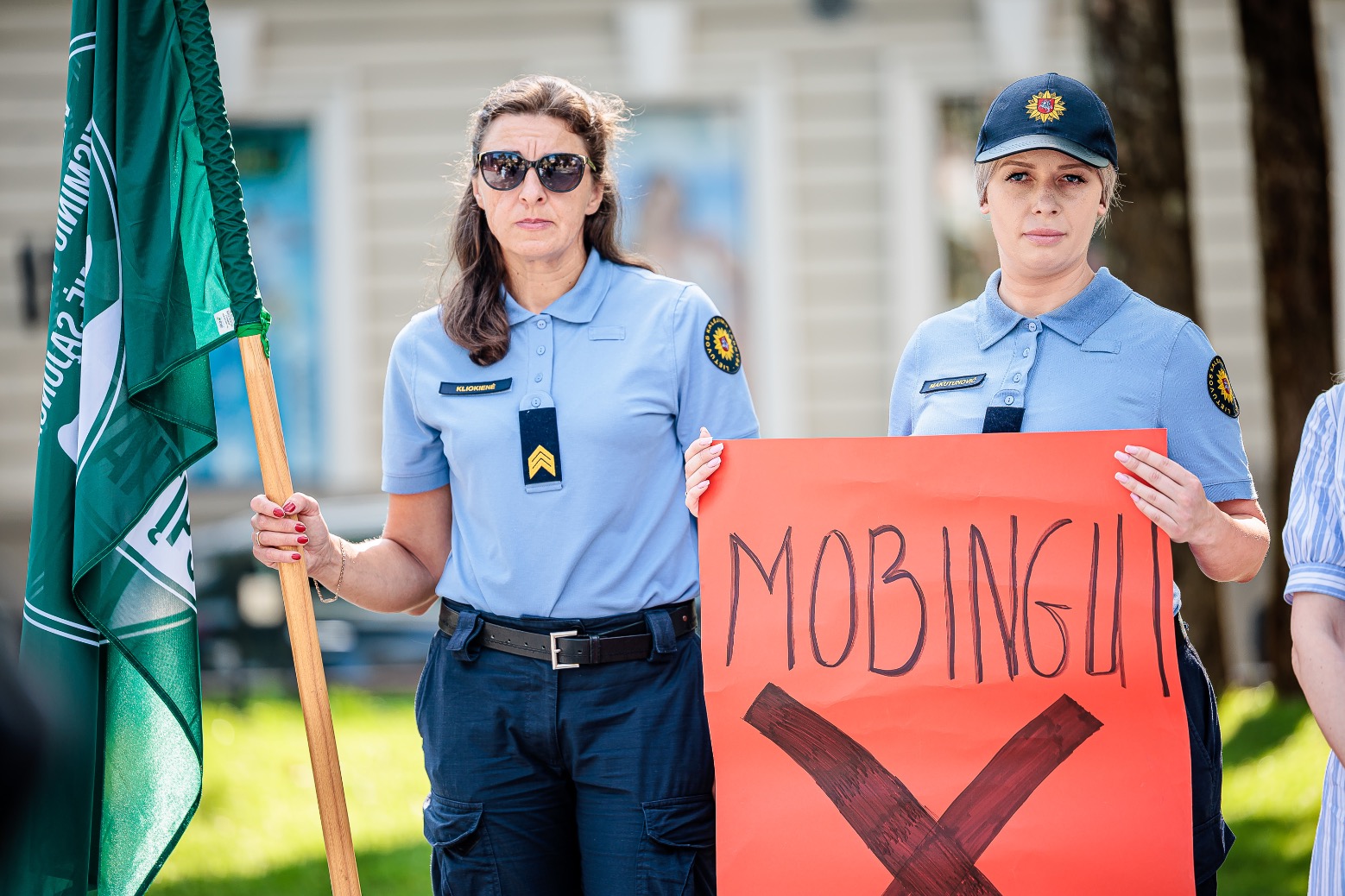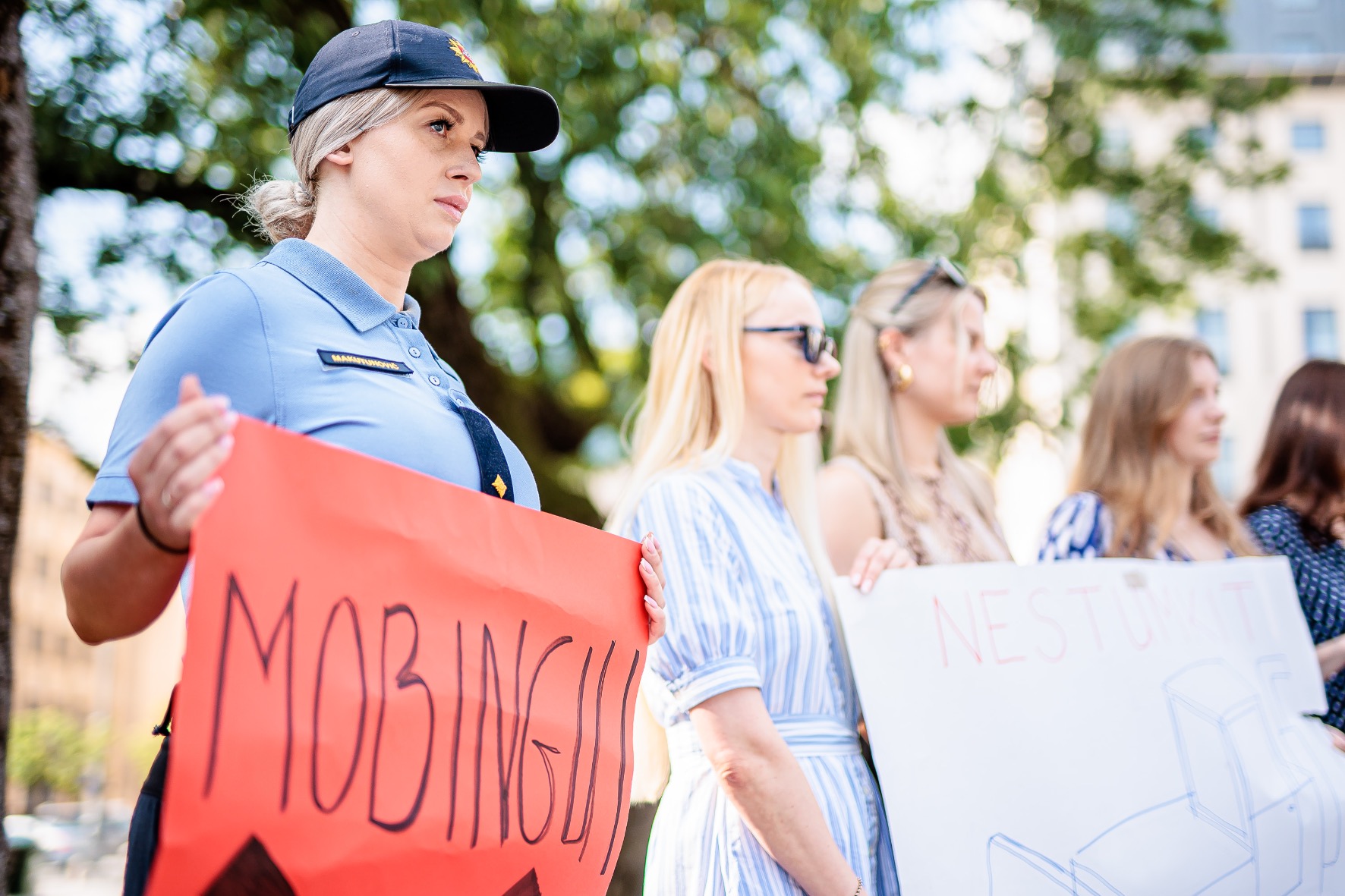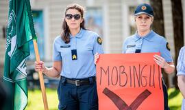 (1)Antradienį prie Vyriausybės rūmų išsirikiavę pareigūnai laikė rankose plakatus su užrašais „Noriu skaidrumo“, „Mobingui – ne“, „Dvigubi standartai“.