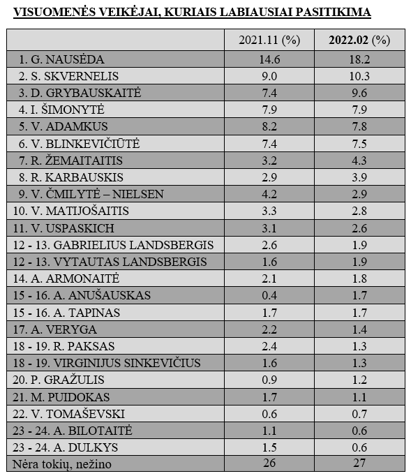 Respondentų buvo prašoma pasakyti, kuriais Lietuvos visuomenės veikėjais jie labiausiai pasitiki, apklausoje dalyvavę asmenys pavardes įvardino patys. Iš viso 2022 metų vasario mėnesį respondentai paminėjo 106 visuomenės veikėjus, kuriais jie labiausiai pasitiki. Kiek daugiau nei ketvirtadalis (27 proc.) apklaustųjų atsakė, kad nėra tokių visuomenės veikėjų arba neatsakė į šį klausimą.