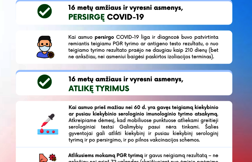· persirgus, kai diagnozė buvo patvirtinta remiantis teigiamu PGR tyrimo ar antigeno testo rezultatu, o nuo teigiamo tyrimo rezultato praėjo ne daugiau kaip 210 dienų (bet ne anksčiau, nei asmeniui baigėsi paskirtos izoliacijos terminas);
