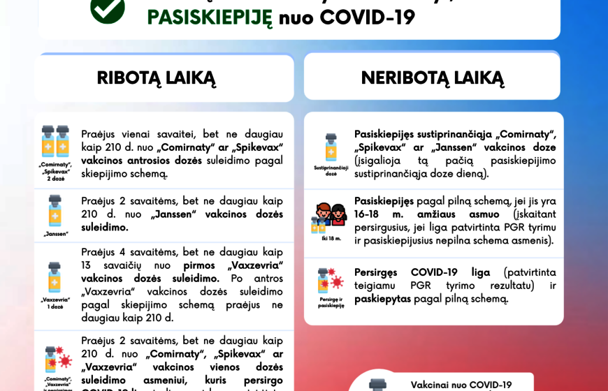 · Ribotą laiką – kai asmuo yra pasiskiepijęs viena iš šių COVID-19 vakcinų: