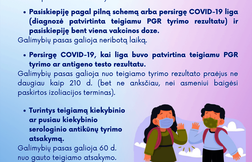 Nuo gruodžio 28 d. šalies gyventojams, pasiskiepijusiems pagal pilną vakcinacijos planą prieš daugiau nei 7 mėn., Galimybių pasas arba jam alternatyvūs dokumentai nebegalios.