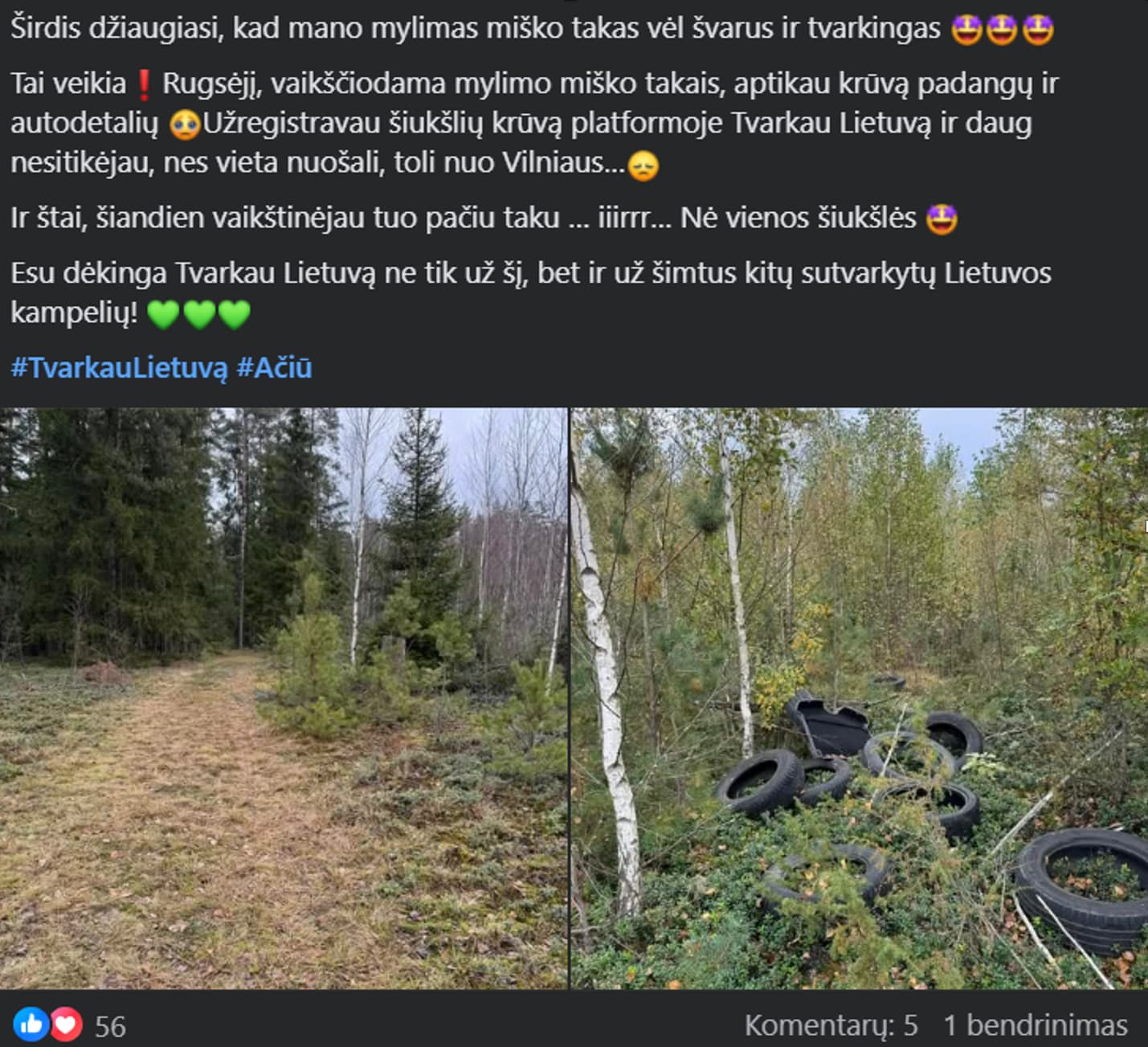 Aplinkosaugininkai dėkoja už aktyvų įsitraukimą tvarkant Lietuvą, o pastebėjus mažus šiukšlių kiekius (pavienes tuščias taras, išmėtytas pakuotes ir pan.) ragina pagal galimybes surinkti ir išmesti į atliekų konteinerius.