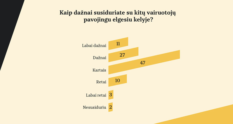 Akivaizdu, kad agresyvaus, neatsakingo vairavimo problema šalies keliuose vis dar egzistuoja, tačiau saugaus vairavimo ekspertus stebina kitas atliekant apklausą išryškėjęs aspektas – lietuviai nėra linkę apie vairuojančiuosius pavojingai informuoti pareigūnus, mieliau renkasi trauktis iš kelio ir juos tiesiog ignoruoti.