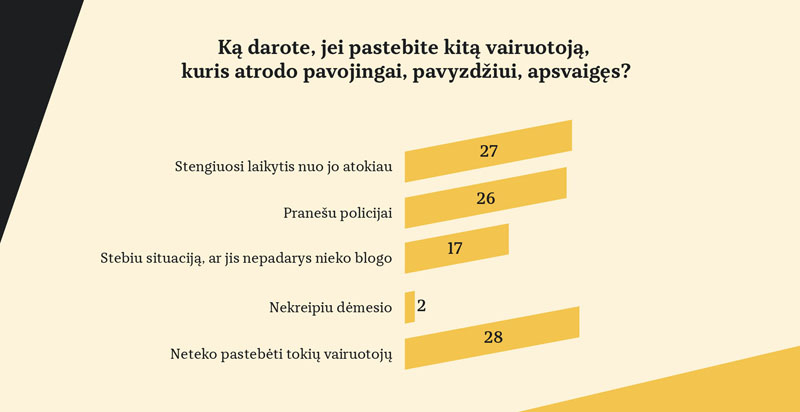 Pastebėję kitą vairuotoją, kuris atrodo pavojingai, pavyzdžiui, yra apsvaigęs, gyventojai dažniausiai stengiasi nuo jo laikytis atokiau (27 proc.), o policijai praneša vos 26 proc. vairuojančių apklaustųjų.