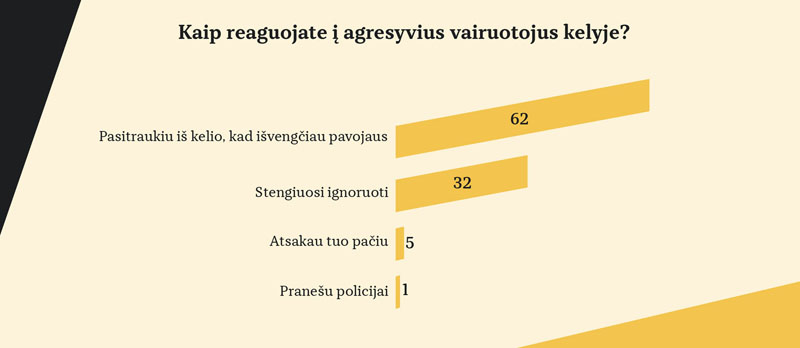 Apklausos duomenimis, trečdalis (32 proc.) apklaustųjų teigė tokius vairuotojus besistengiantys ignoruoti. Net 62 proc. vairuojančių respondentų atliekant apklausą teigė, kad reaguodami į agresyvius vairuotojus kelyje pasitraukia iš kelio, kad išvengtų pavojaus.