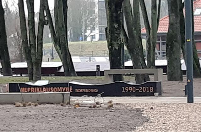 Istorinių įvykių alėjoje stovi suoliukai, skirti svarbiausioms Lietuvos istorijos datoms. Visi – blizgantys juodu granitu. Išskyrus vieną. Arčiausiai vaikų žaidimų erdvės esančio atbrailoje aukso raidėmis puikavosi įrašas „NEPRIKLAUSOMYBĖ INDEPENDENCE 1990-2018“. Tokį vaizdą, negalėdami patikėti savo akimis, žmonės fiksavo nuo šių metų sausio mėnesio.