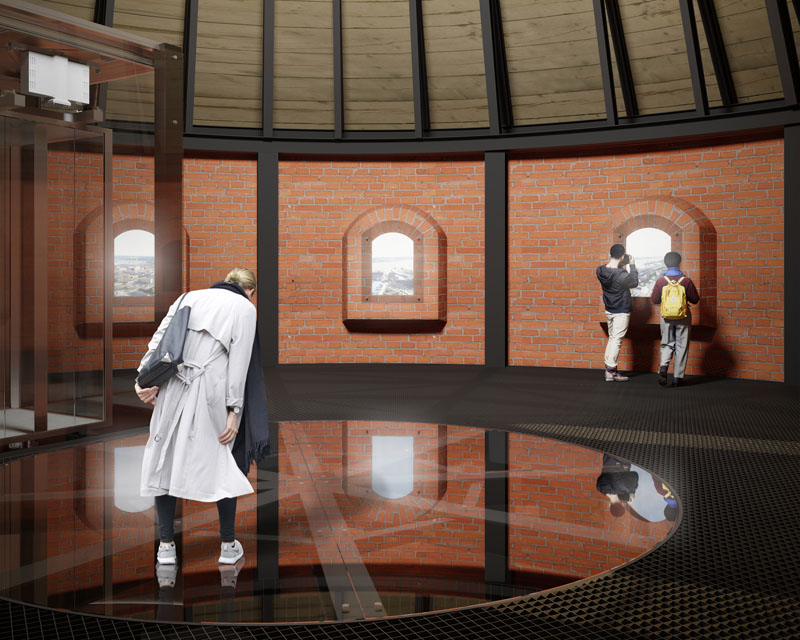 ĮVAIZDIS. Iš išorės bokštą dengs specialiai pagamintų senovinių plytų replikų fasadas, o vidaus konstrukcijos bus metalinės. Atsisakyta įstiklintos apžvalgos aikštelės.