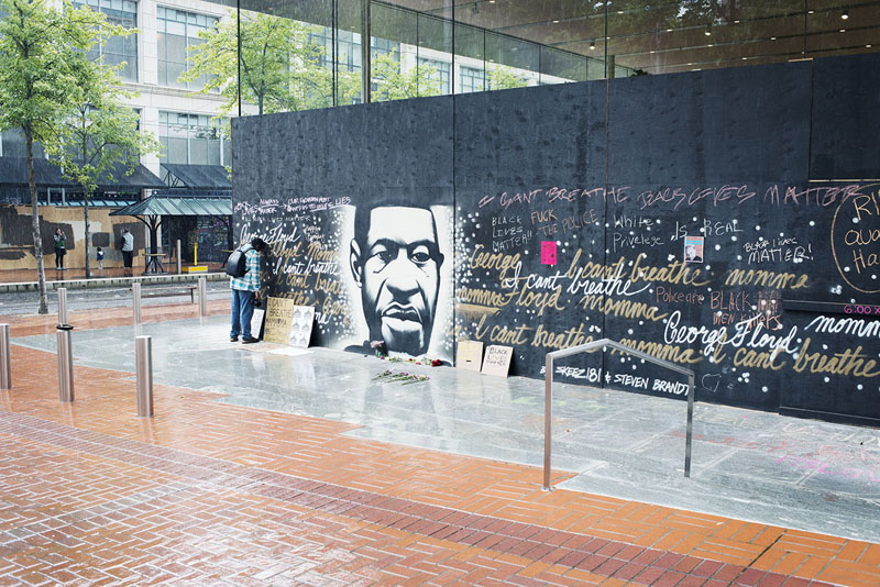 Kitas parodos fotografijų ciklas sukurtas socialine tema. Kai buvo nužudytas juodaodis George'as Floydas, beveik metus laiko JAV miestuose vyko protestai ir streikai. Portlando mieste protestai vyko kas vakarą. Visos firminės parduotuvės vitrinas užsikalė fanera, kad protestuotojai jų neišdaužytų. Visas miestas tapo panašus į faneros fabriką. Baisu eiti į miestą, nes žmonių jame nėra, vien tik fanera. Apokalipsė.