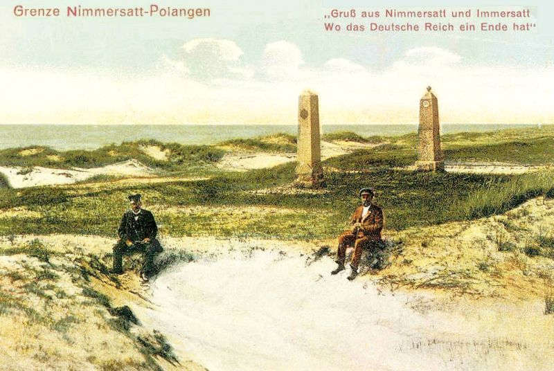 Du obeliskai iš pajūrio kopų ties Nemirseta. Vokietijos imperiją ir carinę Rusiją anuomet skyrę riboženkliai. XX a. pr. atvirukas.