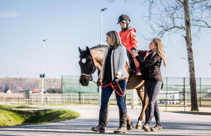 DVIESE. Rita ir Giedrė dirba ranka rankon: viena veda žirgą, kita eina šalia vaiko. Jokių papildomų veiklų nedaroma, kol vaikas teisingai nesėdi ant arklio.