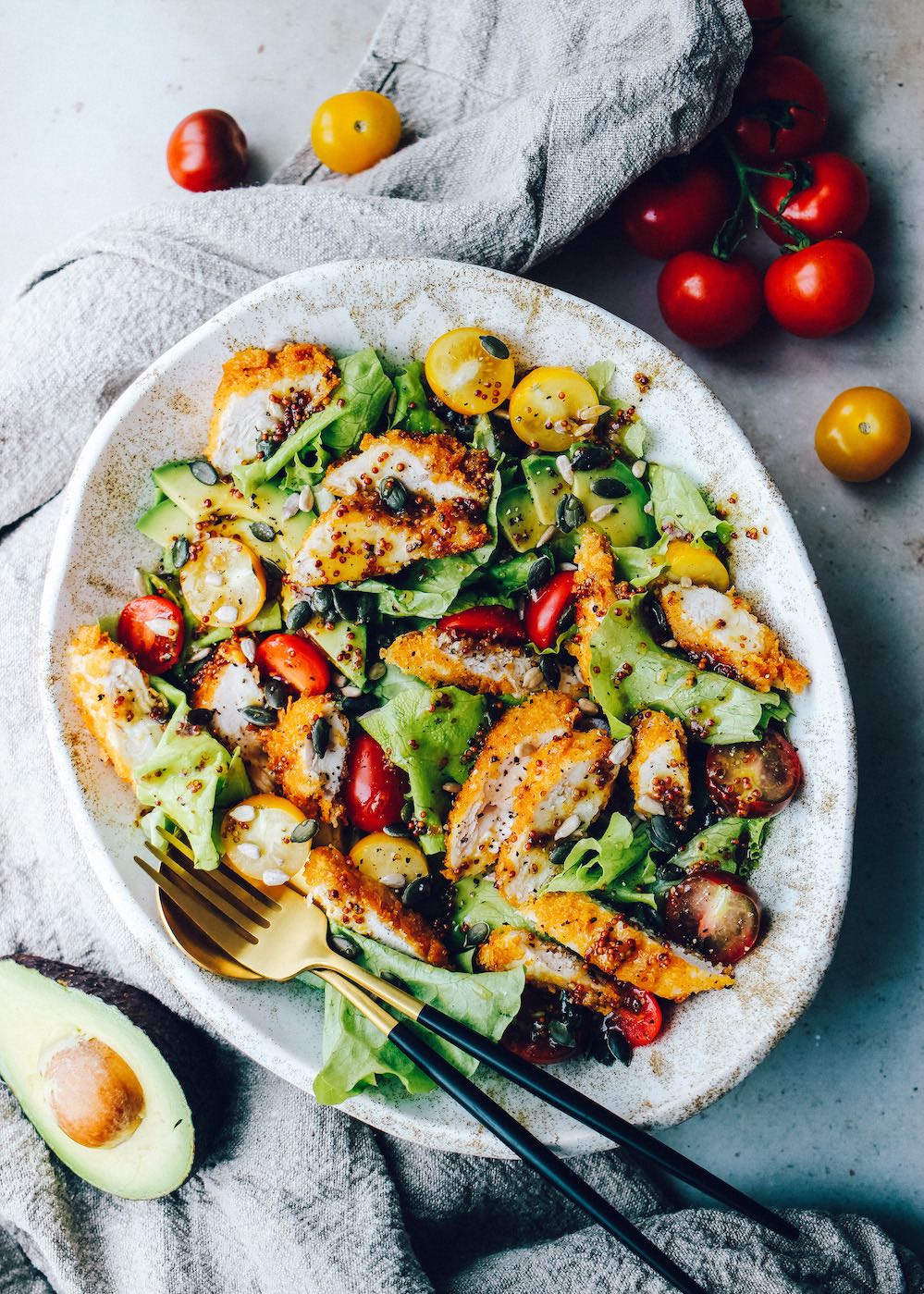 8 vnt. mažųjų vištienos filė dalių, 1 kiaušinio, 50 ml pieno, druskos, pipirų, 1 stiklinės nesaldintų kukurūzų dribsnių, 1/2 a. š. maltos rūkytos paprikos, 1/2 a. š. česnako miltelių, alyvuogių aliejaus, 1 pakuotės lapinių salotų, 1 avokado, 10 vyšninių pomidorų, saujelės moliūgų sėklų, saujelės saulėgrąžų.