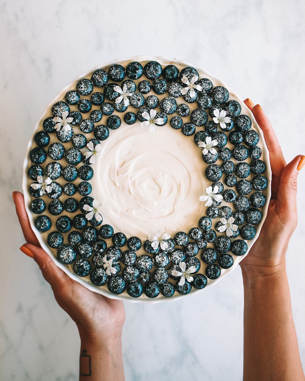 Kreminį sūrį išplakame su vanile, citrinos sultimis ir cukrumi. Kitame inde išplakame grietinėlę, atsargiai įmaišome į kreminio sūrio masę. Ant atvėsusio pagrindo dedame įdarą, išlyginame jį. Apdengiame pyragą maistine plėvele ir siunčiame į šaldytuvą mažiausiai trims valandoms arba per naktį. Prieš patiekdami papuošiame uogomis.