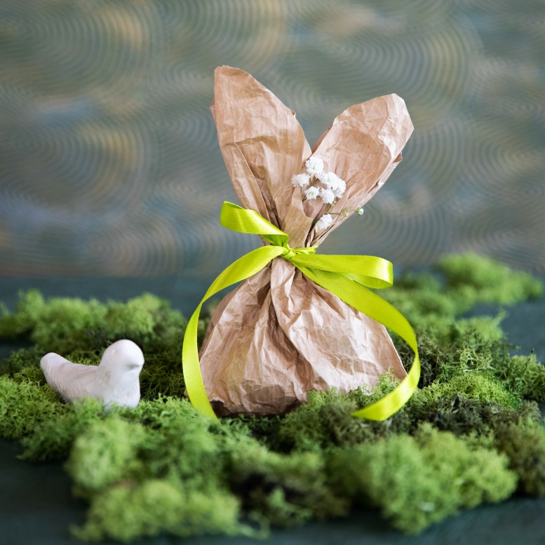 Viršutinėje maišelio dalyje iškirpkite trikampį, suformuodami V raidės siluetą. Sudėję dovanėles į vidų, maišelį užriškite juostele, o iš likusių kraštų suformuokite dekoratyvias „ausytes“. Papildomam akcentui sukurti galite panaudoti natūralias detales – žalumynus, samanas ar šakeles.