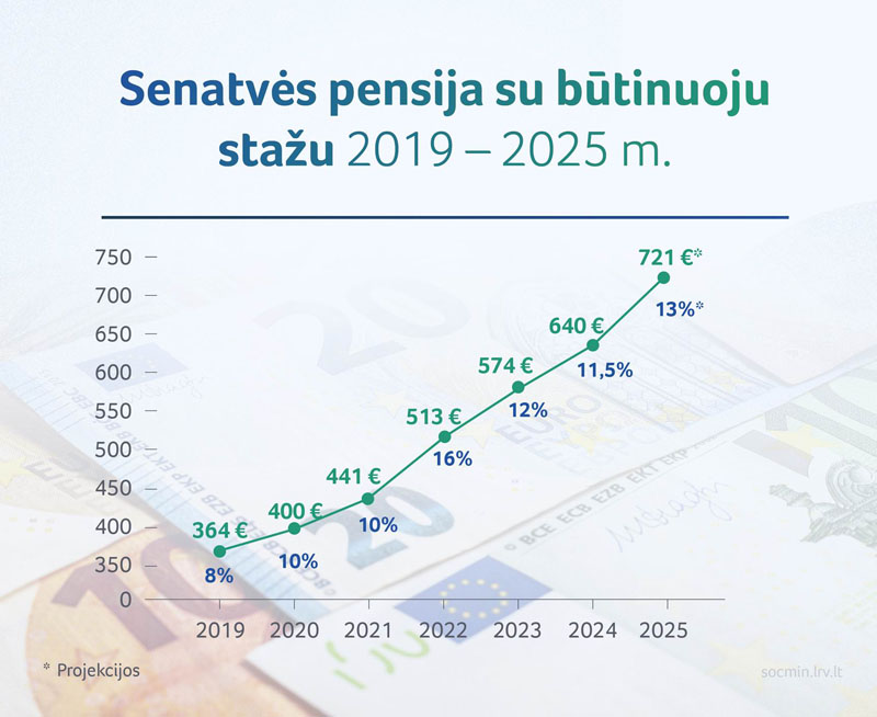 Vidutinė senatvės pensija nuo 2025-ųjų pradžios ūgtels maždaug 73 eurais ir pasieks 673 eurus, o vidutinė senatvės pensija tiems, kurie turi būtinąjį stažą, augs 81 euru ir pasieks 721 eurą.