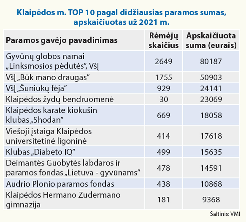 Mokesčių inspekcijos duomenys rodo, kad daugiausia klaipėdiečiai aukojo gyvūnus globojančioms organizacijoms. Joms po nedideles sumas savo sumokėtų mokesčių paaukojo tūstančiai žmonių.