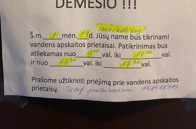 (2)„Antradienį vakare grįžusi namo prie durų radau raštelį, kad trečiadienį bus tikrinami vandens apskaitos prietaisai. Nurodytas tikrinimo laikas man netiko, nes sutapo su darbo laiku,“ - patirtimi dalinosi Romena. Ji trečiadienio ryte nuo 8 valandos bandė skambinti nurodytu telefonu, bet telefonas buvo atjungtas. Pavyko prisiskambinti tik apie 9 val.
