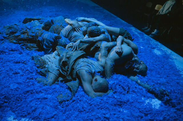 Viso spektaklio metu sninga mėlynais pelenais, kurie iš tiesų yra mėlyno plastiko, gal net šiukšlių maišų, skiautės.