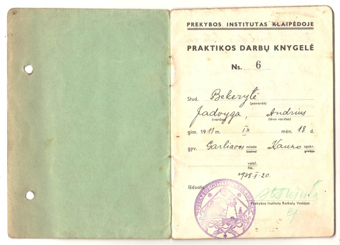 Šis antspaudas buvo uždėtas ant Prekybos instituto Klaipėdoje 16-metės studentės Jadvygos Bekerytės (gim. 1911 m. rugsėjo 18 d.) praktikos darbų knygelės „Ns 6“ (numeris 6), kuri išduota 1938 m. gegužės 20 d. Sužinome, kad J. Bekerytė mokytis į Klaipėdą buvo atvykusi iš tuometės Kauno apskrities, Garliavos miesto (dabar tai - miestas Kauno rajono savivaldybėje, 10 km į pietus nuo Kauno centro).