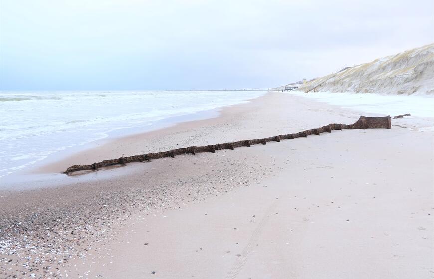 Smiltynėje, keli šimtai metrų į pietus nuo gelbėtojų stoties bangos atidengia 25 metus paplūdimyje kalėjusio ir 1995 m. supjaustyto laivo skeletą.