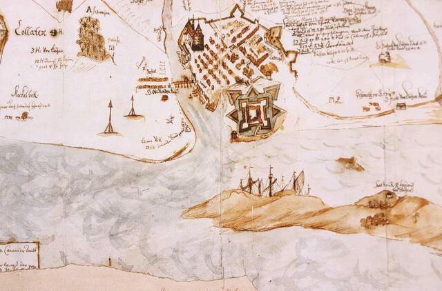 Įdomi detalė: už gigantiškos kopos slepiasi burlaivis. Uostas XVII a. buvo ne pamaryje, o Dangės upėje, tad topografas pavaizdavo saugią vietą: smėliakalnį, už kurio burlaiviai bandydavo išlaukti nepalankaus oro pabaigą.