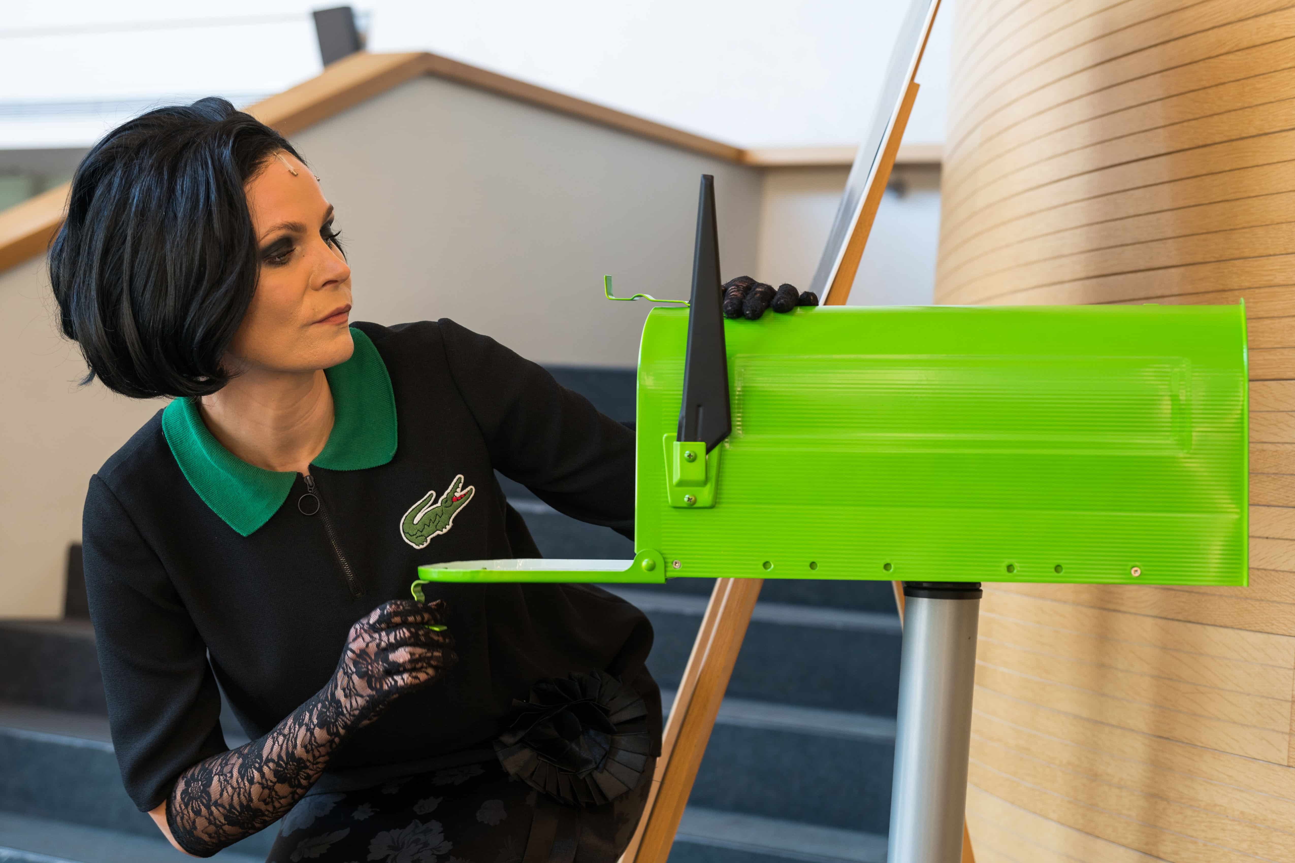 Žiūrovui įėjus į Klaipėdos dramos teatro holą, jį pasitinka žalia pašto dėžutė.