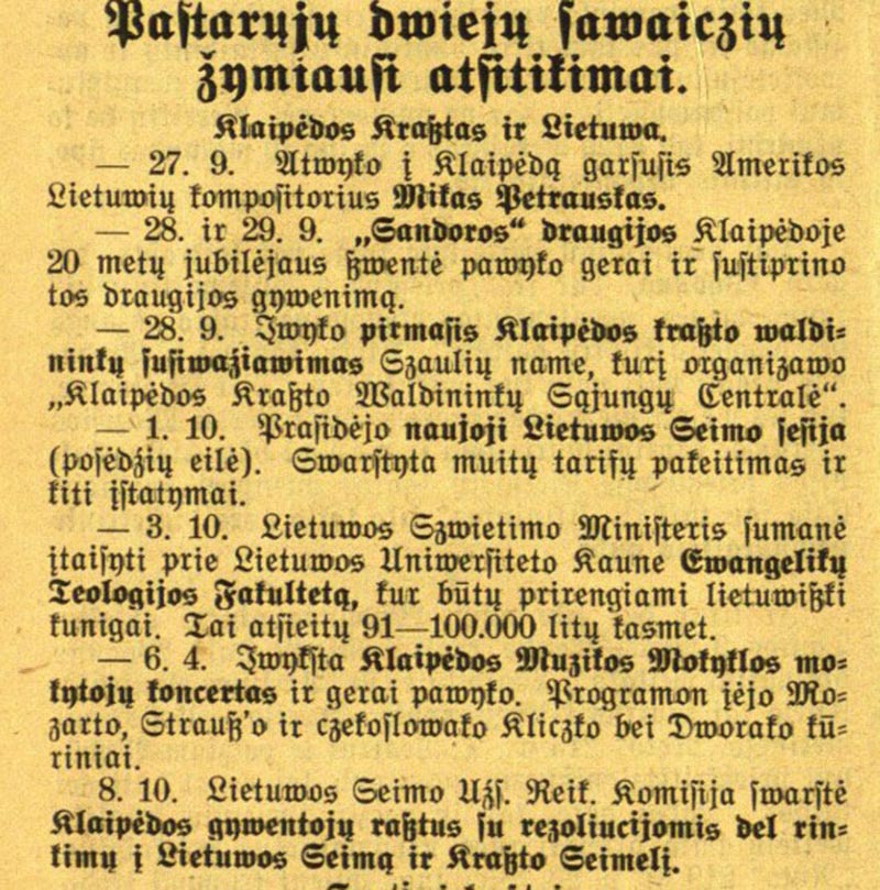 1924 m. spalio 9-osios „Klaipėdos žinių“ pirmajame puslapyje buvo publikuotas didžiausias straipsnis, nagrinėjantis Tautų Sąjungos Tarybos posėdį, kuriame svarstyti Klaipėdos ir Vilniaus klausimai.