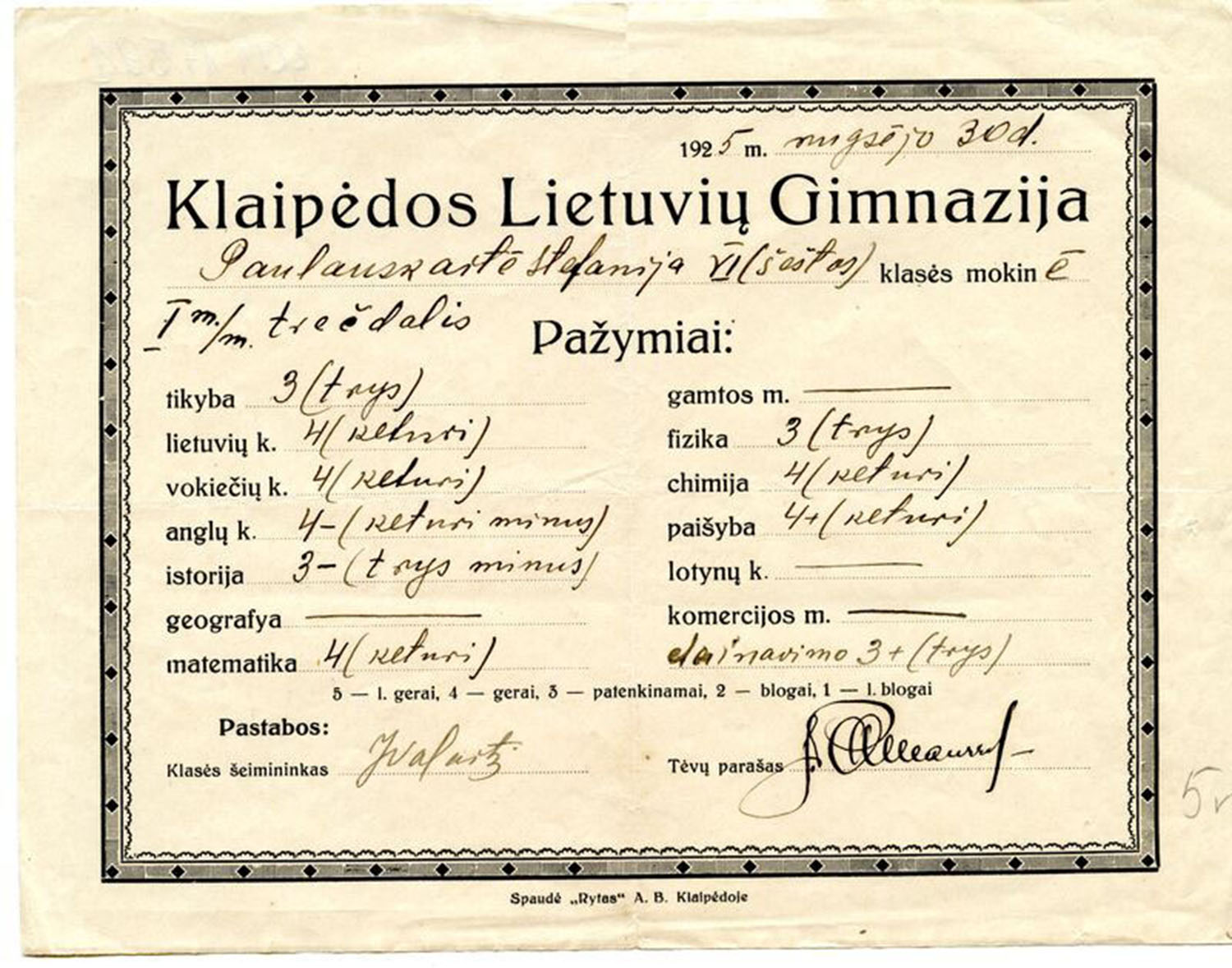 Iš 1925-ųjų Klaipėdos lietuvių gimnazijos pažymėjimo matyti, kad prieš 100 metų vaikai gimnazijoje mokėsi šių dalykų: tikybos, lietuvių, vokiečių, anglų kalbos, istorijos, geografijos, matematikos, gamtos mokslų, fizikos, chemijos, paišybos, lotynų kalbos, komercijos mokslo ir dainavimo.
