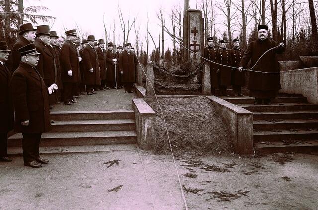 © Iškilmės prie 1923 m. žuvusių savanorių kapo. Klaipėda. XX a. 3 deš. Kalbą sako dr. V. Gaigalaitis. 1925 m. rugsėjo 27 d. ant kapo Klaipėdos šaulių XX rinktinės iniciatyva buvo pastatytas paminklas. Mažosios Lietuvos istorijos muziejaus nuotr.