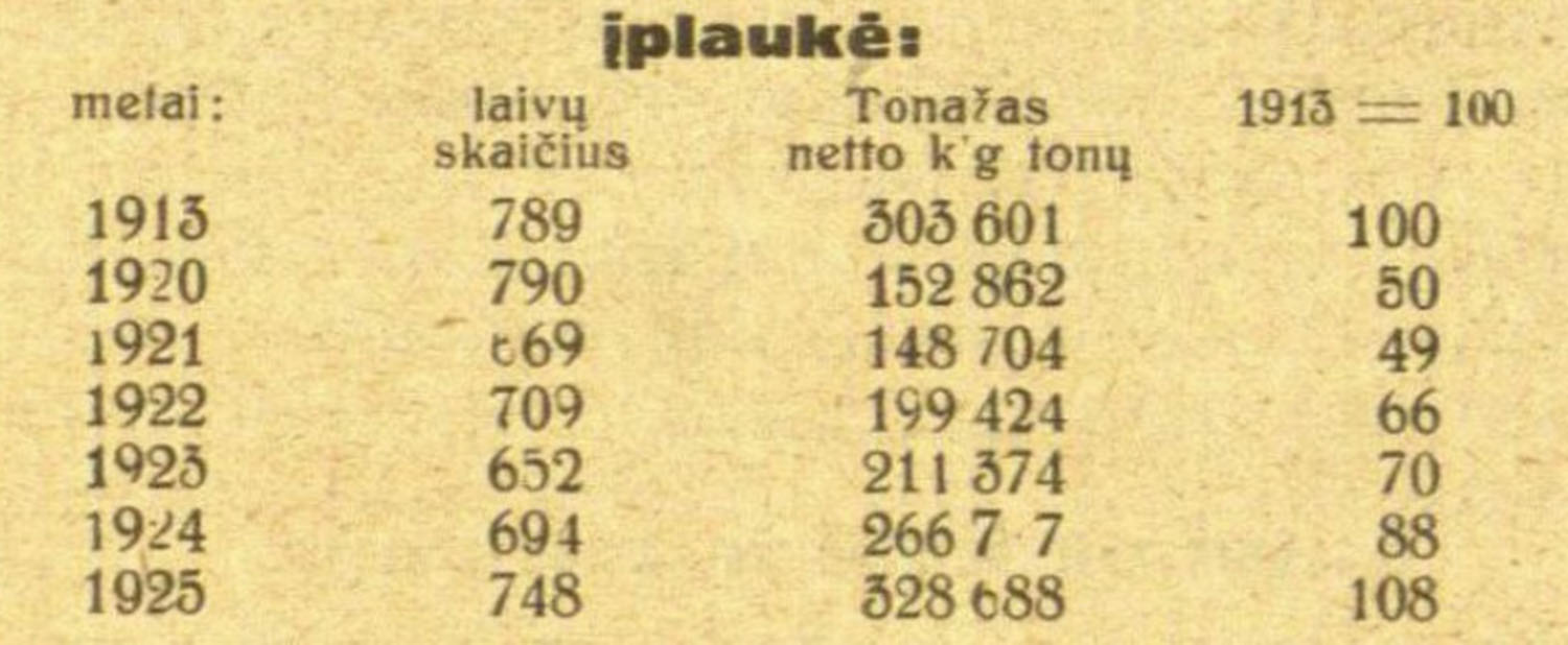 „Lietuvos vyriausybei pradėjus valdyti Klaipėdos uostą, laivų apyvarta tuoj padidėjo. Nors dar 1923 metais “freištatininkai„ bandė nugąsdinti svetimų valstybių laivus įplaukti Klaipėdon, tačiau jų tokie žalingi triūsai išėjo niekais <...>. Klaipėdos uostan įplaukęs laivų tonažas pernai buvo didesnis, negu 1913 metais, kurie skaitomi uosto kelybos išsivystymo stadijos prieš karo aukštuma. Nors 1925 metais įplaukusių ir išplaukusių laivų skaičius yra kiek mažesnis, negu 1913 metais, bet tai neturi jokios reikšmės.