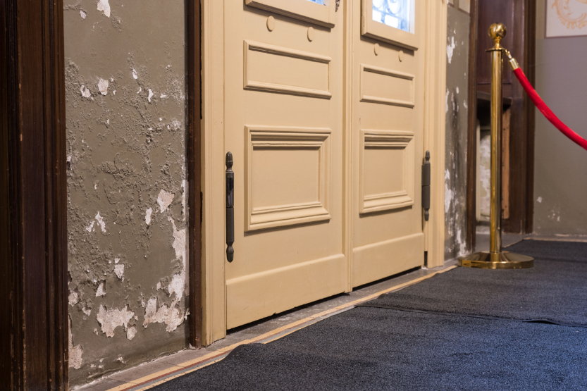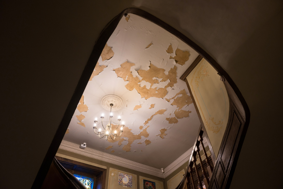 O „geriausia“ – vos įėjus į muziejų ir palipus aptrupėjusiais laiptais pasitinka savotiškas „meno kūrinys“. Tik ne ten, kur turėtų būti – o ant lubų. Vaizdas išties baisus.