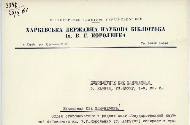 Charkovo Mokslo bibliotekos 1961 10 20 prašymas, kad atsiųstų knygą „O buvo taip“, laimėjusią sąjunginiame konkurse II laipsnio diplomą. Originalas, rusų kalba.