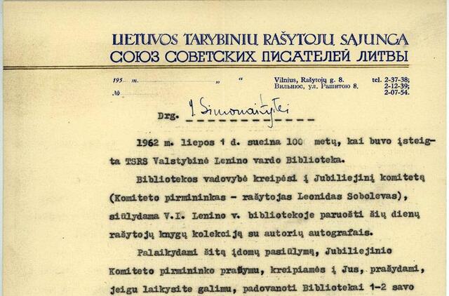 Palaikydami šitą įdomų pasiūųlymą, Jubiliejinio Komiteto pirmininko prašymu. kreipiamės į Jus, prašydami, jeigu laikote galimu, padovanoti Bibliotekai 1-2 savo knygas su autografais. Knygas siųsti šiuo adresu: Москва, центр, Государственная библиотека СССР им. В. И. Ленина, Юбилейному Комитету.