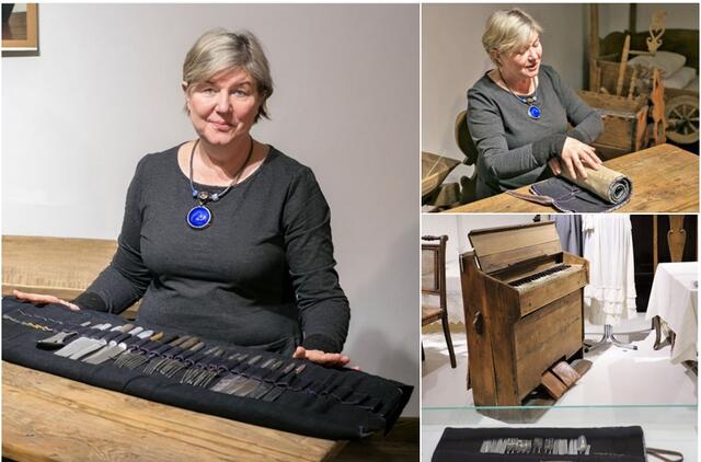Asta Strumilienė Mažosios Lietuvos istorijos muziejuje prie savo močiutės Annos Perkamienės (gim. Kaiser) stalo įrankių rinkinio, 2019.