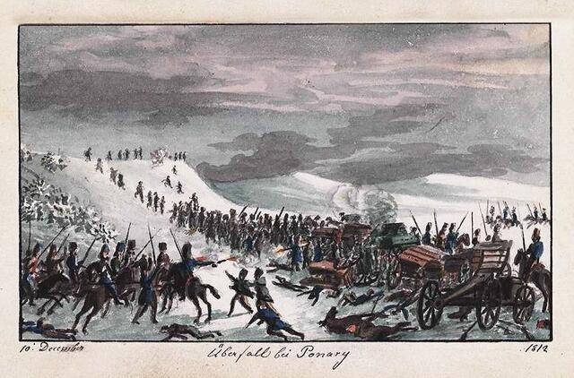Apačioje – jo piešinys „Užpuolimas prie Panerių. 1812 m. gruodžio 10 d.“