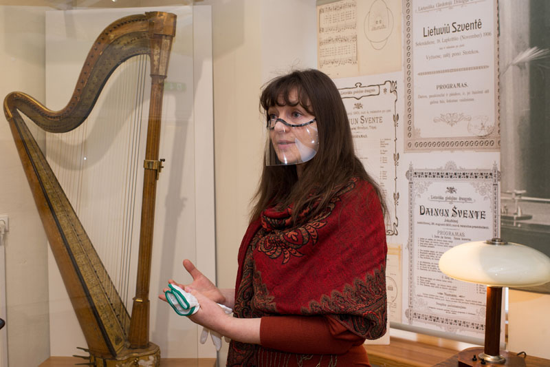 Muziejininkė Reda Cirtautienė pristato Vydūno arfą - svarbiausią muziejaus eksponatą.